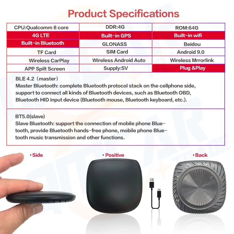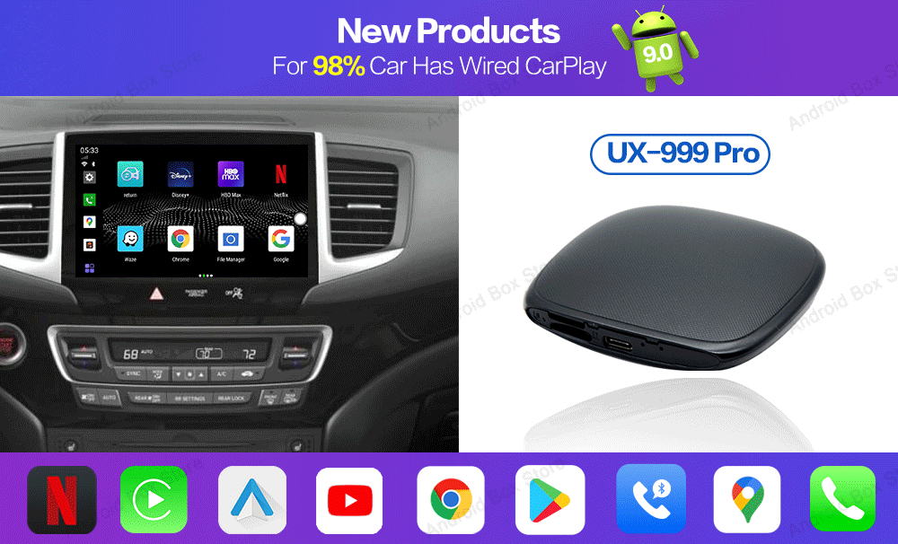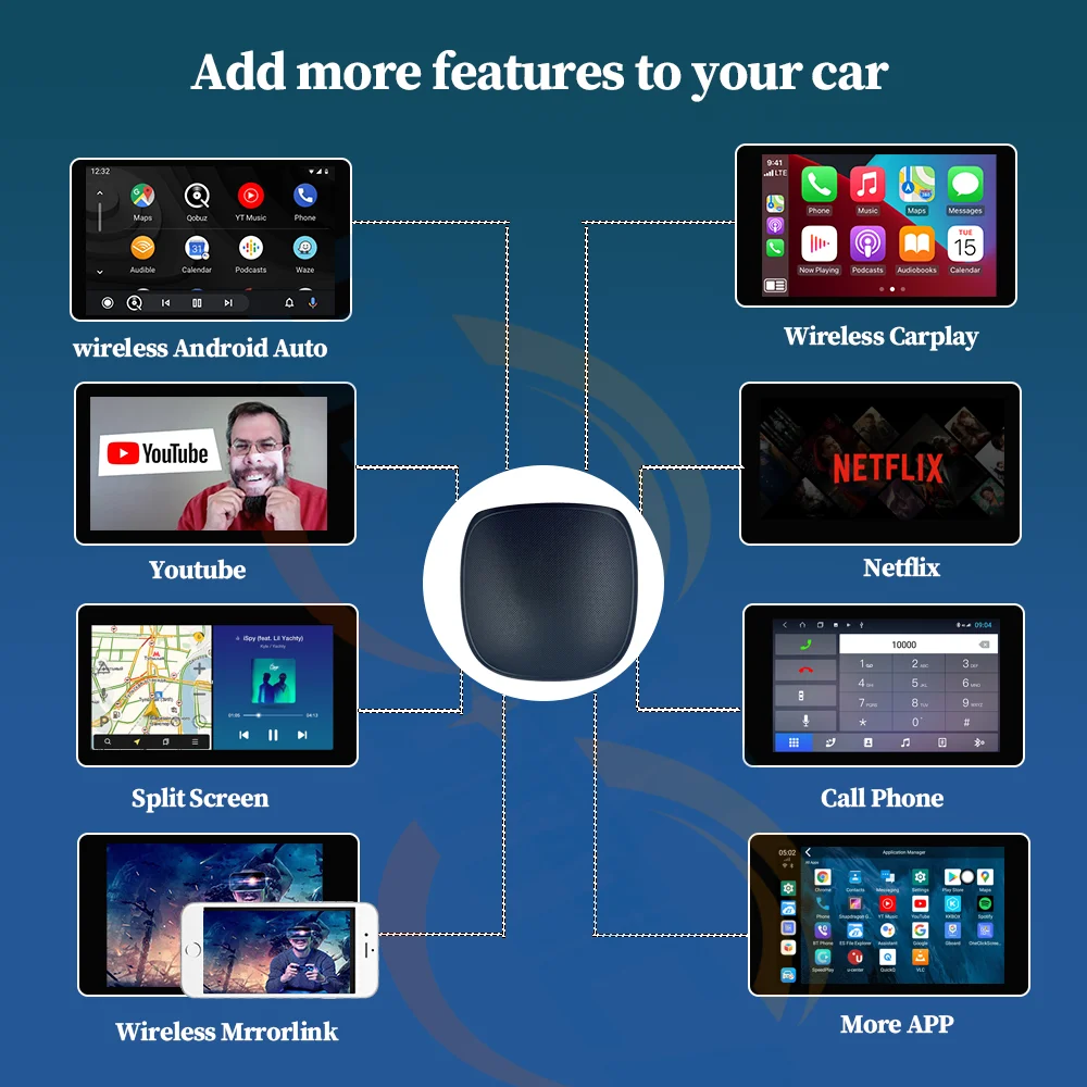 7. It also provides the functions of wired CarPlay to wireless CarPlay, and wired CarPlay to wireless Android Auto.youtube ,Netflix,Google Play ect